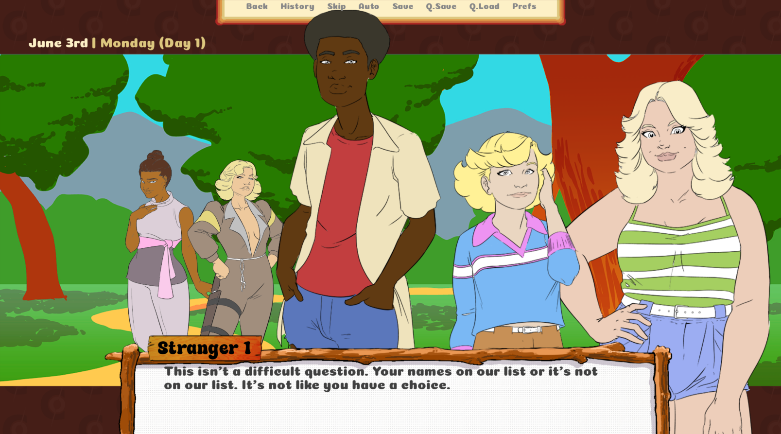 Crossover is a mystery-adventure visual novel set at a 1970's summer camp. Stay up late, make friends, and embrace nature as you search for answers to so many of life's great questions.